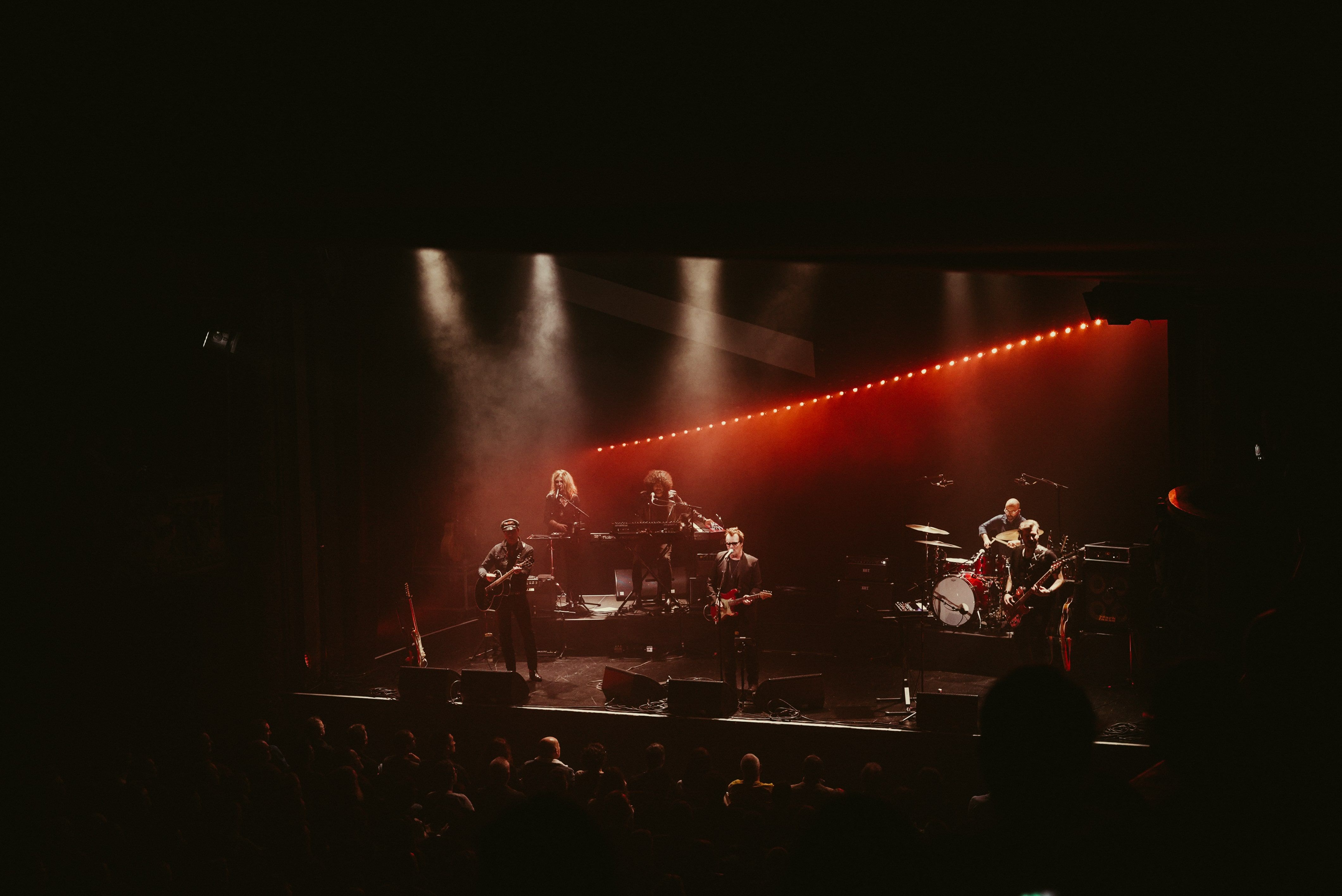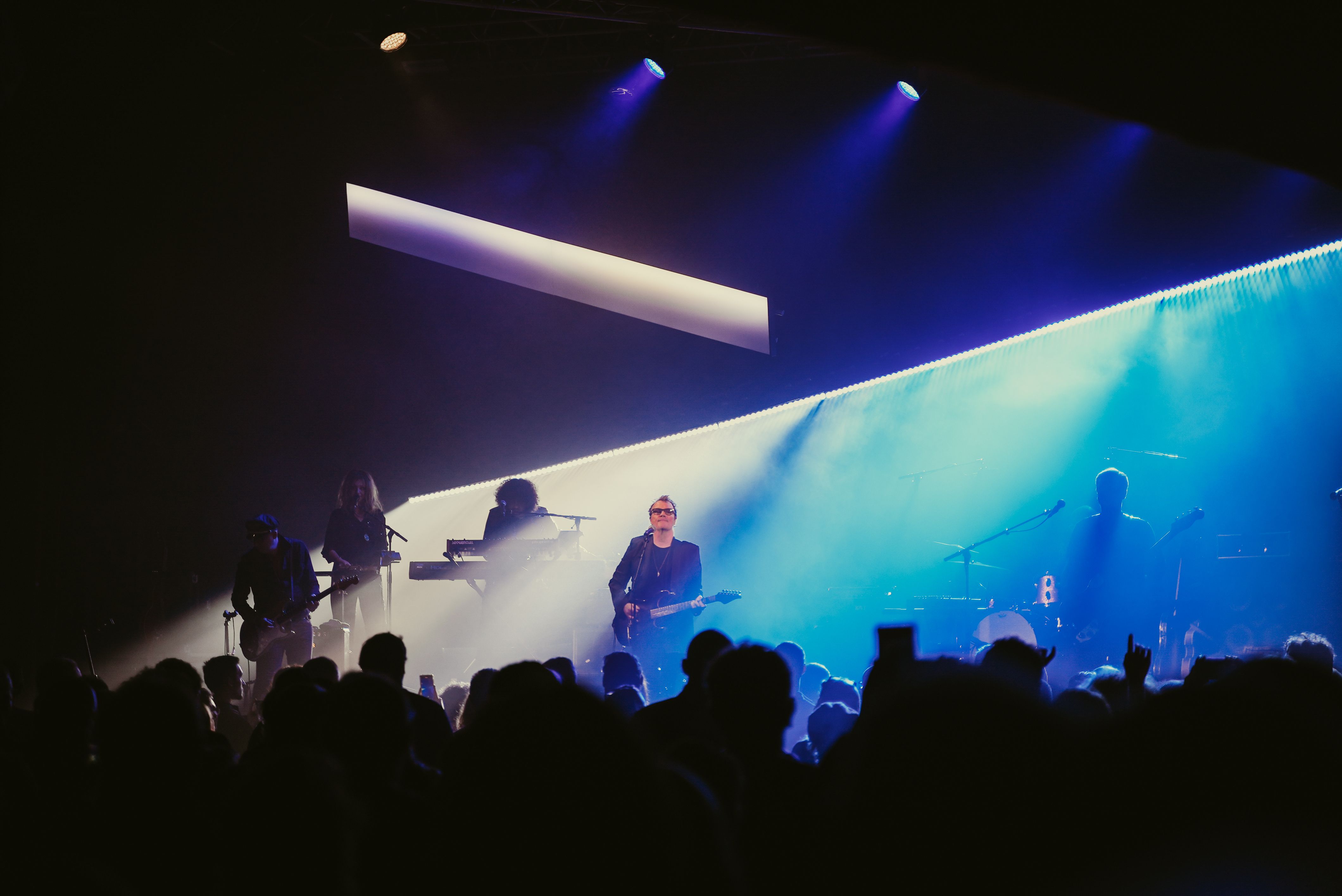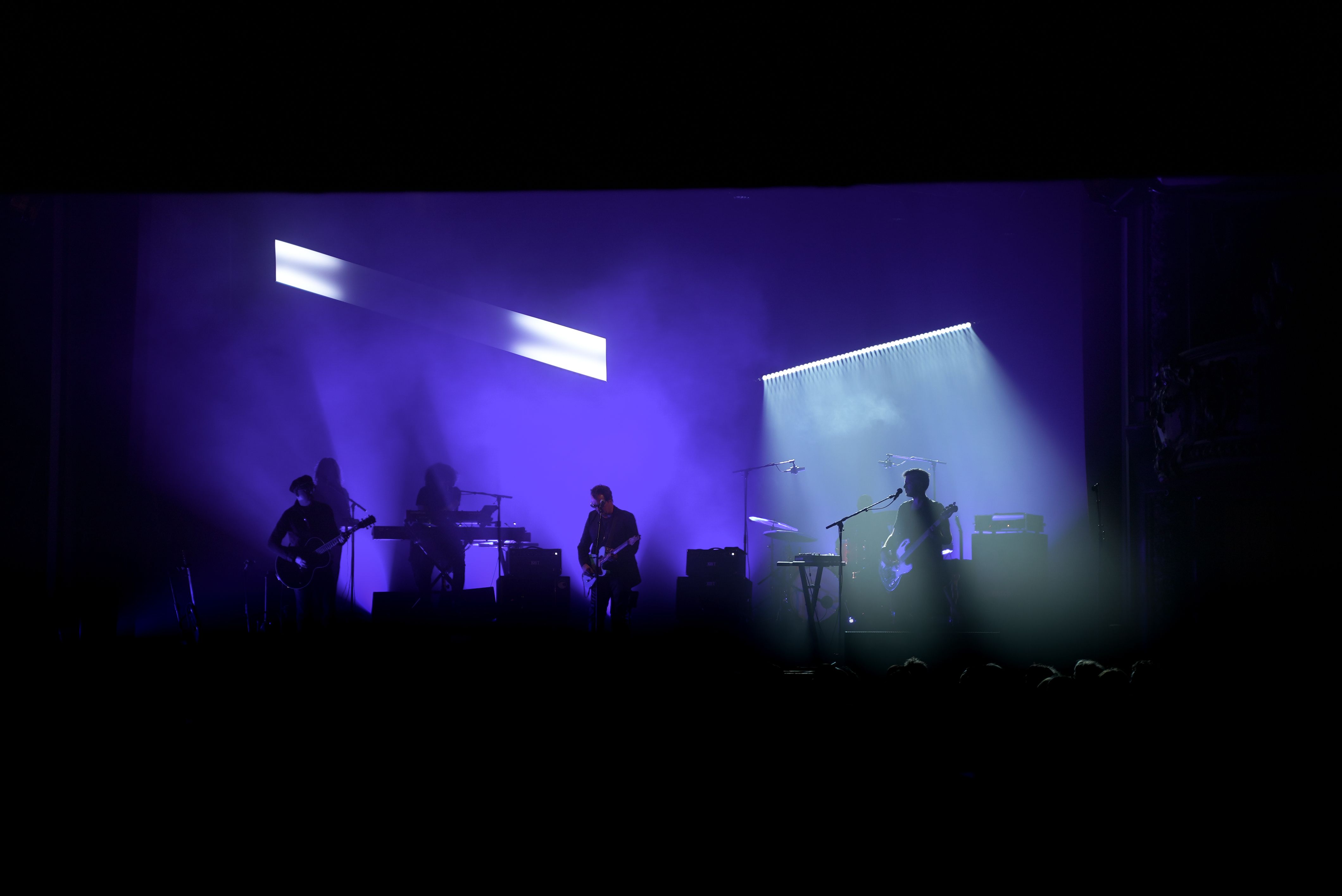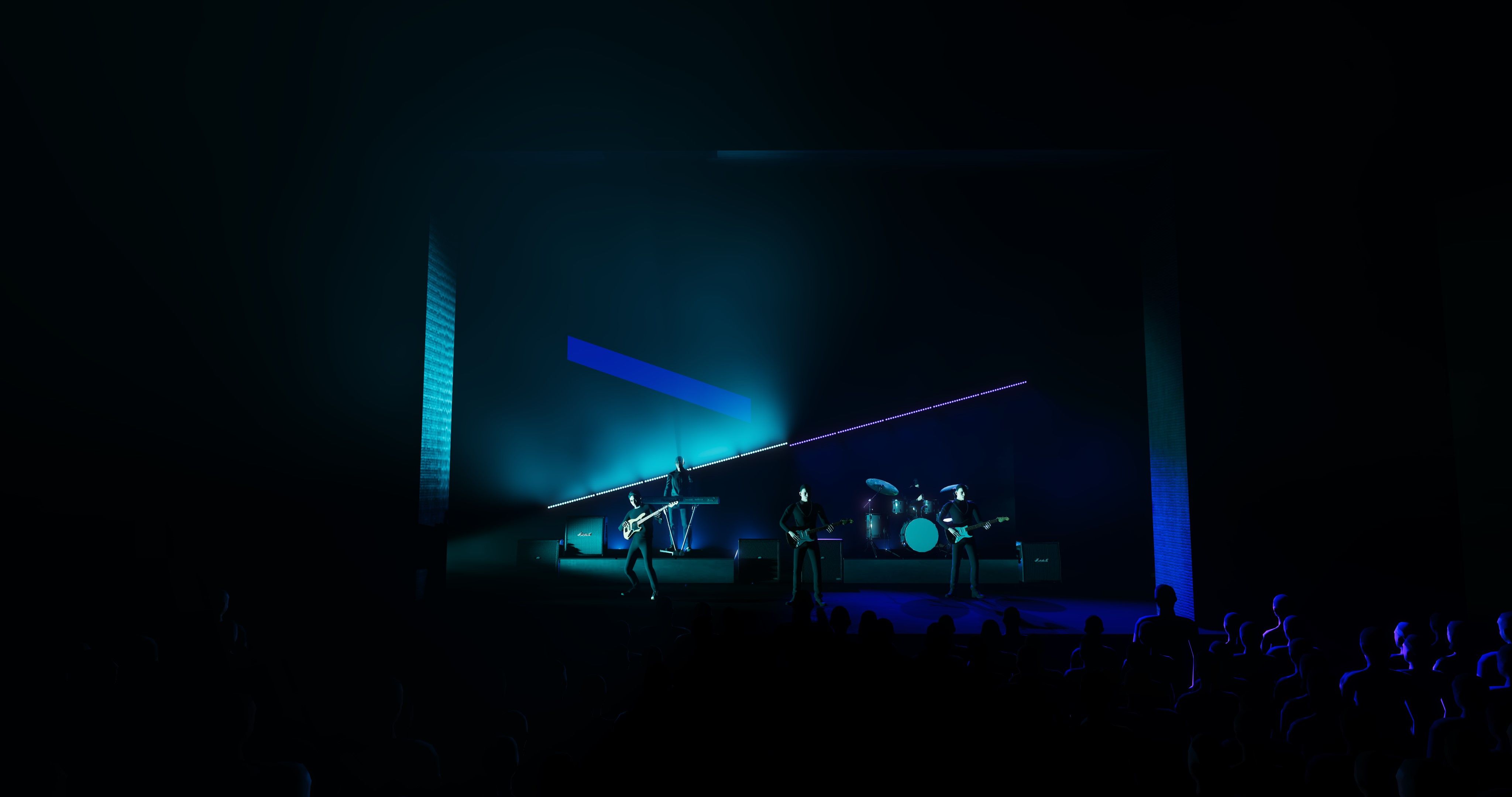 Cette scénographie joue avec les contrastes et les angles de lumière à l'aide d'un caisson lumineux et une ligne de barres lumineuses obliques. Cette composition s’inspire de la pochette de l’album et permet de créer un fond dynamique et un éclairage en contre.