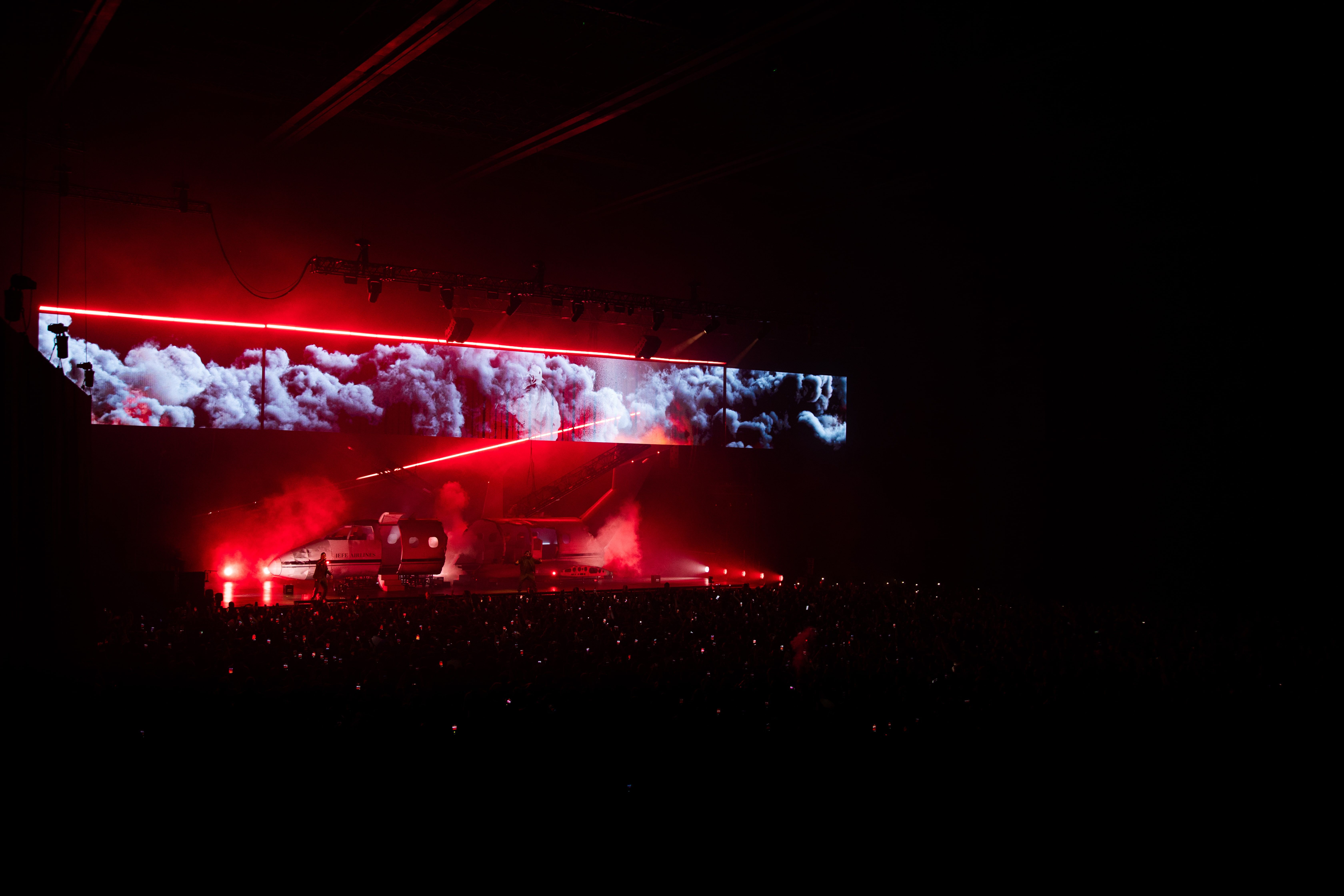 La scénographie représente la carcasse d'un avion qui s'est crashé sur scène. À l'avant-scène, un écran panoramique semi-transparent permet d'intégrer le décor physique de l'avion dans différents univers visuels. La lumière est travaillée de façon à mettre en avant la scénographie en dialogue avec la vidéo et la musique. Le kit lumière est conçu de manière très tranchée avec des lignes de lumières sur des ponts asservis, dans le but de varier les configurations scéniques.